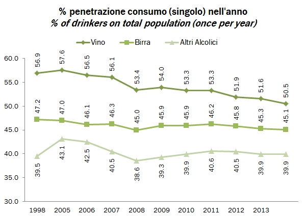 Nella sua strutturale discesa, la penetrazione di consumo di vino in Italia nel 2014 ha toccato la soglia magica del 50%, cioè 27.5 milioni di consumatori, di cui 16.9 milioni di uomini e 10.6 milioni di donne. Il grafico qui sopra già vi dice molto: il consumo di bevande alcoliche va diradandosi in maniera strutturale. Il consumo abituale di vino invece nel 2014 è stabile al 39% dei bevitori, cioè 10.7 milioni di persone, di cui ben 7.8 milioni sono uomini. Dunque il trend discendente di quest’ultimo indicatore sembra essersi interrotto nel 2014, ma sul lungo termine è evidente che continuerà a scendere, soprattutto in termini assoluti, vista la discesa della penetrazione totale del consumo. Invece, per la prima volta da diversi anni si ferma la progressione del consumo sporadico, rimasto inchiodato poco sotto il 26% della popolazione.