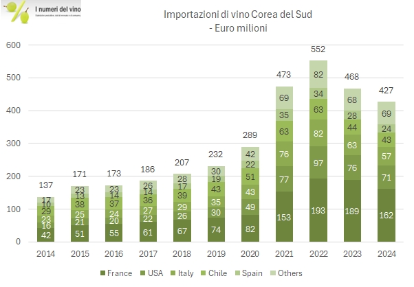 Le importazioni di vino in Corea subiscono un ulteriore calo del 9% nel 2024, da 468 a 427 milioni di euro. Il grafico degli ultimi anni è pericolosamente simile a quello delle importazioni cinesi di vino traslato indietro di 5-6 anni e i due paesi non sono distanti né geograficamente né per abitudini storiche. La Corea è però un mercato più ricco. Importa vino a 8 euro al litro, contro i 5 della Cina e ha un PIL pro-capite quasi triplo. In questo senso possiamo immaginare che l’andamento (e il potenziale) siano diversi. Un dato che mette qualche dubbio è quello dei volumi, che sono rapidamente saliti da 0.4 milioni di ettolitri nel 2019 a 0.7-0.8 nel biennio 2021-22, il che lascerebbe intendere che ci possa essere stato un eccesso di spedizioni da smaltire, che ha riportato il volume importato a 0.5 milioni di ettolitri nel 2024. Tutto questo per dire che l’impressione tra il calo cinese e quello coreano sono diverse e probabilmente i “fondamentali” del mercato coreano sono più solidi di quelli cinesi.