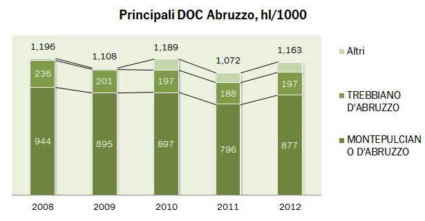 L’Abruzzo ha avuto nel 2012 un buon anno in termini di produzione di vino DOC. Come ben sapete leggendo queste pagine, è una regione che apprezzo per la forte concentrazione su due nomi importanti, un vino bianco e un vino rosso, anzi forse tre con il rosato e poi sostanzialmente non c’è altro di una rilevanza tale da poter in qualche modo sfondare nel mondo del vino globalizzato. Dicevamo che la produzione di vino secondo Federdoc ha raggiunto 1.16 milioni di ettolitri per quanto riguarda i vini DOC, con un incremento del 9% rispetto allo scorso anno e marginalmente sopra la media degli ultimi 4-5 anni che è stata di circa 1.15 milioni di ettolitri. Procediamo con l’analisi…