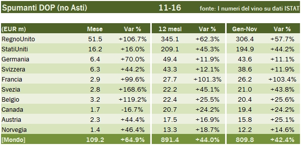 Il 2016 sarà senza dubbio ricordato come l’anno della definitiva consacrazione internazionale dei vini spumanti italiani. Le esportazioni a consuntivo dell’anno parlano di un incremento del 22% a 1.2 miliardi di euro e di un corrispondente aumento del volume esportato a 3.4 milioni di ettolitri. Come sappiamo si tratta di una esplosione principalmente legata ai paesi anglosassoni, Regno Unito e USA su tutti, ma ci sono altri segnali positivi nei mercati minori, quando invece l’anno è stato positivo ma meno esplosivo in altri mercati consolidati come la Germania. I segnali del mese di dicembre, comunque poco interessante dal punto di vista stagionale, sono meno positivi dei mesi precedenti, con un leggero calo del valore esportato, essenzialmente legato al -20% realizzato nel mercato inglese, che ha spinto la categoria degli spumanti DOP giù del 5%, a fronte di un saldo annuo in crescita del 32%. Passiamo all’analisi dei dati.