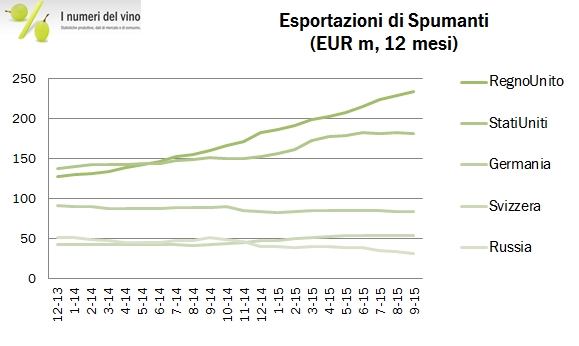 Come dicevamo la scorsa settimana, settembre 2015 è il primo mese da molto tempo che le esportazioni di spumante non segnano un segno positivo… sono andato a controllare e sono dovuto arrivare a aprile 2010 per vedere un segno meno… qualcuno direbbe che prima o poi doveva capitare ed è capitato, in un mese che per gli spumanti comincia a essere importante (insieme ai prossimi due). A settembre abbiamo esportato 85 milioni di spumanti rispetto a 88 dello scorso anno. I prossimi due mesi, ottobre e novembre sono mesi da 100 milioni ciascuno, cioè critici per fare quel 940-950 milioni a cui si potrebbe ambire per il 2015. Che sta succedendo? Beh, le cose negative che non cambiano sono relative all’Asti spumante, che sta vivendo un vero e proprio calo strutturale, mentre per gli spumanti DOP i dati restano positivi ma, obiettivamente, non è possibile crescere all’infinito del 20%… settembre segna un +12%, anche in questo caso la crescita più bassa da almeno un anno a questa parte. A livello generale, potremmo dire che sta riprendendo il calo della Russia, che si era stabilizzata, e che non sta più crescendo il mercato americano, mentre il Regno Unito continua a “tirare”. Vediamo qualche numero insieme.