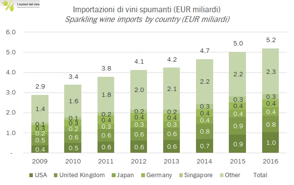 La stabilità dell’euro/dollaro ha ridato coerenza ai dati del trade mondiale di spumanti nel 2016 nelle diverse valute L’incremento delle importazioni di spumante nel 2016 è stato del 3% a 5.75 miliardi di dollari o 5.2 miliardi di euro (come per l’anno scorso il dato calcolato dalle dichiarazioni di export è leggermente superiore, circa 5.98 miliardi di dollari). Gli importatori in crescita a doppia cifra sono gli USA, che superano il miliardo di euro di import, il Giappone che è il terzo mercato mondiale per la categoria e, partendo da valori molto più limitati, la Russia, dove però il dato 2016 rappresenta il primo numero positivo dopo due anni di forte calo. Dall’altra parte, e non è una sorpresa, troviamo il Regno Unito, -5%, ma anche Singapore (-8%) o il Belgio (-4%). Passiamo all’analisi dei dati.