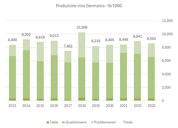 Oggi sfruttiamo i dati molto precisi forniti dal Deutsches Weininstitut GmbH per un’analisi approfondita della produzione vinicola tedesca del 2023. Il 2023 è stato un anno quasi allineato alla media produttiva storica, 8.6 milioni di ettolitri contro 8.7, anche se la produzione della categoria più pregiata di vini (Prädikatswein, ossia i nostri DOCG) è rimasta come negli anni precedenti un po’ sotto la media storica: i 2 milioni di ettolitri prodotti sono “soltanto” il 24% del totale. La maggior parte dei vini tedeschi resta nella categoria (Qualitätswein, che corrisponde alla nostra DOC), che rappresentano il 73% della produzione totale e si caratterizzano per la possibilità di aggiungere zucchero per correggere il grado alcolico. Come vedremo dall’evoluzione della superficie vitata, la Germania continua a “girare” verso i vini bianchi e a far crescere un pochino il totale degli ettari, segno che il cambiamento climatico sta aiutando la produzione vinicola nel paese. Il Riesling resta il principale vitigno, ma la moda sta ora spingendo i nuovi impianti verso il Pinot Grigio e Bianco e lo Chardonnay.