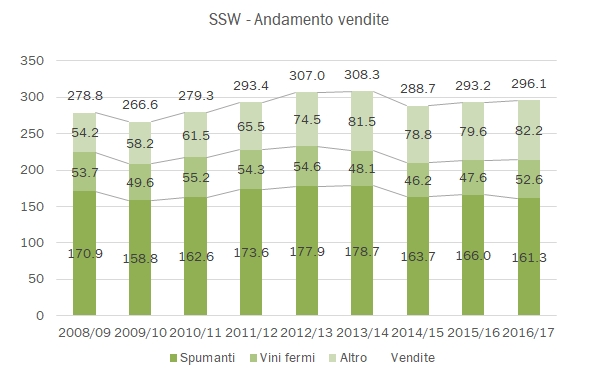 Due forse sono le cose che vale la pena di trattenere da questa analisi: primo, l’aumento del peso dei vin di qualità che ormai toccherebbe l’83% del valore totale. Secondo, gli andamenti nel tempo, che mettono in luce come il settore abbia forse toccato un livello di picco nel 2014-16…