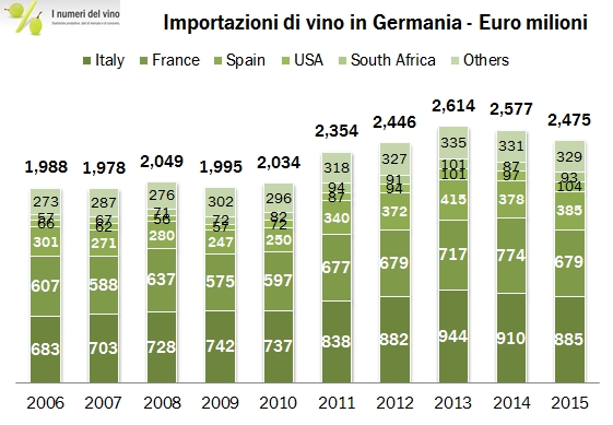 Le considerazioni fatte qualche mese fa sull’andamento tutt’altro che positivo delle importazioni tedesche di vino si ripresentano oggi, commentando i dati finali del 2015 rilasciati da UN Comtrade data. I tedeschi importano meno vino, il 3% meno dell’anno scorso e il 6-7% meno del massimo storico del 2011, e spendono anche meno, il 4% meno del 2014. La posizione competitiva del prodotto italiano è stabile, abbiamo perso un po’ nel 2014 e recuperato nel 2015, nonostante i nostri vini spumanti non funzionino in Germania, il che è una bella mancanza per il nostro export, e nonostante il nostro prodotto sfuso sia calato pesantemente per lasciare posto al prodotto spagnolo (in volume, non in valore). Quindi la conclusione per l’Italia è che nonostante tutto le cose non sono andate male, grazie chiaramente all’andamento positivo dei vini imbottigliati, stabili in un mercato calante. E gli altri? I francesi giù del 12%, ma dopo un anno particolarmente positivo. Crescono tutti i vini del nuovo mondo, americani e cileni in primis, ma certamente partono da valori di 8/9 volte più contenuti dei nostri e va notato che la debolezza dell’euro ha reso questi prodotti più cari, inducendo dunque un effetto prezzo nel valore delle importazioni.