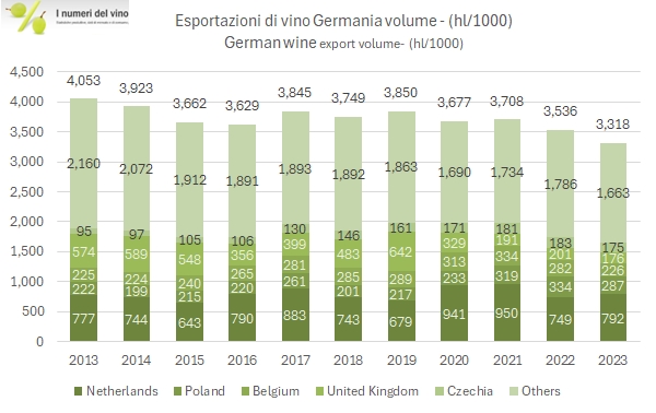Comunque, nel 2023 siamo di fronte a un anno di scarsa produzione mondiale, calata come sapete da 263 a 237 milioni di ettolitri, mentre il prezzo medio di esportazione mondiale stimiamo sia cresciuto del 10% da circa 390 a 430 euro per ettolitro (mentre per la media dei prezzi degli ultimi 3 anni siamo più intorno a +15%). Da ciò deriviamo, mediando i prezzi sugli ultimi 3 anni appunto, che il valore mondiale della produzione di vino sia vicino ai 95 miliardi di euro, mostrando negli ultimi 10 anni una crescita annua media di 2.5-3 miliardi di euro, ossia intorno al 3-4%.