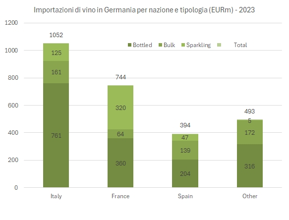 I dati di UN Comtrade sulle importazioni tedesche di vino presentano uno scenario di leggero calo (-3%, 2.7 miliardi di euro, con i vini spumanti in leggera crescita) su un livello che comunque è di stabilità se guardiamo agli anni precedenti. L’Italia perde un po’ meno (-2%) ma guadagna quindi leggermente in quota di mercato, che nel 2023 ha superato il 39% delle importazioni in valore e il 38% in volume. I volumi sono nel 2023 stabili a circa 13.7 milioni di ettolitri. Perdono terreno i francesi, soprattutto nel segmento dei vini fermi (ma non crescono comunque negli spumanti), guadagna la Spagna, perdono americani, sudafricani e cileni a vantaggio della Nuova Zelanda. Nel resto del post trovate un’analisi dettagliata, grafici e tabelle che sono anche consultabili in formato Google Sheet nella sezione Solonumeri. Buona lettura.