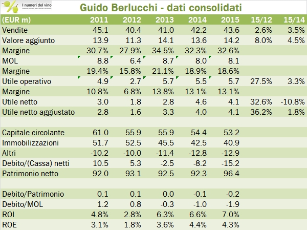 Guido Berlucchi ha messo a segno nel 2015 un ulteriore leggero incremento delle vendite, mentre gli utili sono rimasti sostanzialmente stabili rispetto allo scorso anno. Il dato veramente positivo, come anche negli scorsi esercizi, è relativo alla generazione di cassa, che continua a essere copiosa (7 milioni di euro nel 2015) e che porta la posizione finanziaria del gruppo in territorio ancora più positivo (15 milioni) dello scorso anno, a quasi 2 volte il margine operativo lordo, grazie alla concomitanza di un ulteriore calo del capitale circolante e a un livello di investimenti molto contenuto. I dettagli contenuti nel bilancio sono molto scarsi. L’azienda redige anche un prospetto secondo criteri gestionali, che mostra un MOL di 9 milioni di euro rispetto a 8.1 che viene esposto nella nostra tabella, “tirando fuori” circa 600mila euro di perdite di una fantomatica area accessoria e circa 0.3 milioni di euro di svalutazione del capitale circolante. Andiamo brevemente a leggere i numeri 2015.