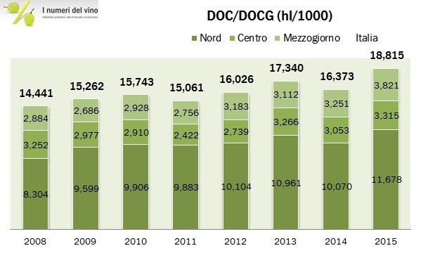 ISTAT ha finalmente aggiornato i dati sulla produzione 2015, che ho pensato fosse il caso di mettere in linea il più presto possibile. Il post è ricco di tabelle, anche perchè da quest’anno si aggiunte una ulteriore dimensione, che è la produzione di vini bianchi e rossi per tipologia, che trovate in una delle tabelle nel post. Il 2015 è stata una grande annata e la sua grandezza si legge anche nelle quantità, che sono le più alte dal 2006 per quanto riguarda il totale e di sempre nel segmento DOC/DOCG, 18.8 milioni di ettolitri. La produzione totale finale censita da ISTAT è di 47.7 milioni di ettolitri, che diventano 49.3 milioni quando si aggiungono 1.7 milioni di ettolitri di mosto. Si tratta di un progresso del 20% rispetto alla annata 2014, molto cattiva, e del 9% rispetto alla media decennale. Cone avrete letto, le previsioni sono per una seconda ottima annata anche nel 2016 (anche se i conti poi si fanno alla fine): sembra quindi che il settore possa lavorare su un biennio di ottime annate, il che dovrebbe consentire di mantenere la spinta alle esportazioni anche da un punto di vista dei volumi. Detto questo, ci addentriamo un po’ nei dati, anche se grafici e tabelle già vi dicono molto.