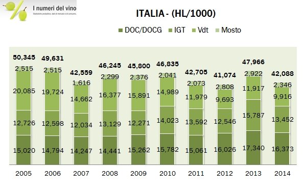 Spero con questo post di darvi la migliore fotografia possibile della produzione di vino italiana nel 2014, dato che il sito dell’ISTAT oltre a rilevare i dati con colpevole ritardo (23 luglio 2015) fa molta confusione. Tipo? Confrontando nel corso degli anni dati che includono i mosti o meno, sommando per due volte la produzione di Trento e Bolzano che (maledizione) sono riprodotte in tutte le tabelle regionali, dimenticandosi di correggere le produzione DOC siciliane per il passaggio da IGT a DOC della denominazione Sicilia, mettendo dati sulle superfici vitate che sono francamente inpubblicabili. Fine del piagnisteo, però sarebbe necessario che Unione Italiana Vini o Federvini suoni la campanella e metta ordine tra ISTAT, ISMEA, INEA, MIPAAF, Federdoc e compagnia.