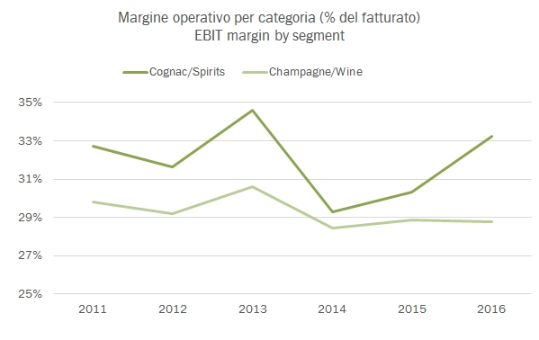 I risultati 2016 di LVMH hanno sorpreso gli investitori, anche se le azioni del gruppo non hanno reagito molto positivamente a causa del commento di Bernard Arnault (il maggiore azionista) il quale ha dichiarato che le azioni erano care… se lo dice lui che gestisce l’azienda… Tornando a noi, il 2016 della divisione vino e spiriti del gruppo ha beneficiato della ripresa del Cognac, cresciuto del 10% in volume e del buon andamento dello Champagne, +3% a volume, mentre per i vini fermi è stato un anno un po’ meno positivo dei precedenti. I margini sono tornati sopra il 30% dopo due anni difficili, soprattutto grazie alla forte ripresa del Cognac e degli spirits, mentre per lo Champagne e per i vini la profittabilità non è migliorata, anche a causa di un forte impatto negativo derivante ai cambi (circa 3% sullo Champagne/Vini) che si ricollega sicuramente alla svalutazione della sterlina. Il management non ha dato particolare indicazioni sul 2017 per quanto riguarda la divisione, ma ha commentato in generale che l’anno sarà più difficile del 2016. Vedremo cosa succederà, anche se è chiaro che il recupero del Cognac in Cina e il suo forte sviluppo nel mercato americano hanno già dato i loro frutti. Passiamo all’analisi dettagliata dei numeri.