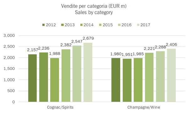 LVMH ha subito un deciso rallentamento nella seconda parte dell’anno nella sua divisione vino, mentre l’area dei beni di lusso è continuata a crescere e ha spinto le azioni al rialzo. I dati finali del 2017 sono comunque in crescita del 4-5% ma si compongono di un primo semestre eccezionalmente positivo (vendite +12% e utile operativo +21%) e un secondo semestre con vendite stabili e utile operativo in calo del 7%. Che cosa ha determinato questo rallentamento? Certamente i cambi: nel primo semestre le vendite furono aiutate dai cambi (+2%), mentre a fine anno siamo passati a -2%. Ma anche la crescita organica è stata meno vibrante: da +10% nel primo semestre siamo passati a +7% sul fine anno. Per la parte più interessante per noi, le consegne di Champagne sono scese da +8% nel primo semestre a +1% nel secondo semestre, quelle degli altri vini erano stabili nel primo semestre e sono calate dell’1% nel secondo. A supportare le vendite in termini di mercati sono sempre gli USA e la Cina, mentre un freno viene oltre che dai cambi anche dalla disponibilità limitata di prodotto da vendere e dal temporaneo rallentamento delle consegne di Glenmorangie in Asia. Gli investimenti continuano: nel corso del 2017 LVMH ha comperato un whisky americano (Woodinville) e una cantina in California, Colgin Cellars (con una quota del 60%). Ma passiamo ad analizzare i dati in dettaglio.