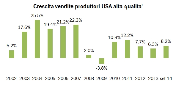 Il consueto studio della Silicon Valley Bank sullo stato di salute delle aziende californiane produttori di vino mette sul tavolo uno scenario ottimistico. Al di là dei numeri, che poi commentiamo e che in due parole ci hanno visto nel 2014 un anno in accelerazione (+8% per il fatturato) con margini in miglioramento, per il 2015 secondo la banca sarà un anno molto interessante. In particolare, in uno scenario per l’economia americana particolarmente favorevole, loro prevedono: 1) una terza vendemmia di seguito con ottimi volumi e qualità per la California; 2) un trend molto forte di “premiumisation”, particolarmente per i vini sopra i 20$ per bottiglia, già partito nel 2014, cui si contrappone un andamento atteso negativo per i vini sotto i 9% per bottiglia; 3) un anno record per le aziende californiane che producono vini di qualità, con una crescita delle vendite che dal livello di cui abbiamo detto dovrebbe “spaccare” su un livello tra il 14% e il 18%. Se questo fosse vero, il “gap” di cui parlavamo lo scorso anno con le aziende italiane, che post-crisi 2009 non era così largo, potrebbe effettivamente aumentare.