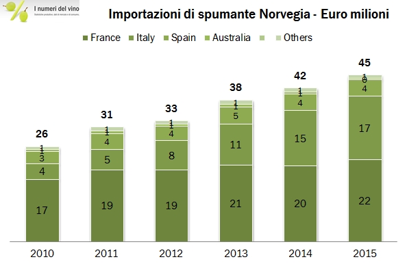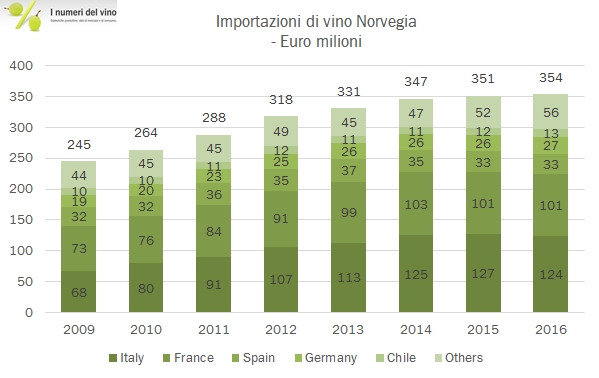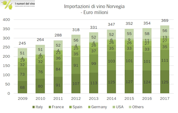 La Norvegia è un altro mercato in cui l’Italia ha vissuto anni di temporanea leadership a danno della Francia e dove ora le gerarchie si sono ristabilite. Già lo scorso anno avevamo commentato il sorpasso della Francia dopo qualche anno di primato italiano, nel 2019 la distanza è aumentata, grazie al +7% segnato dalle importazioni norvegesi di vino francese contro il dato stabile dell’Italia. Una componente importante di questa difficoltà dei nostri prodotti è relativa agli spumanti, che i norvegesi non sembrano apprezzare (o almeno non i nostri), ma nel 2019 anche il vino in bottiglia italiano è cresciuto meno di quello francese. Tornando ai numeri generali, la Norvegia ha importato nel 2019 386 milioni di vino, +3%, con un progresso lento ma costante negli anni. I volumi sono esigui, 0.9 milioni di ettolitri e sostanzialmente stabili nel corso degli anni. Passiamo ai dettagli.