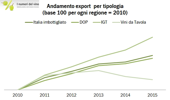 Passando alle conclusioni dell’analisi sui dati Ateco, il 2016 ha visto un incremento del 4% circa delle esportazioni, dove a eccellere è stato il Veneto, spinto dal Prosecco, con un incremento del 9% a 2 miliardi di euro, mentre le due altri principali regioni, Toscana e Piemonte, sono rispettivamente in leggera crescita e in leggero calo. Molto positivi appaiono i dati per le aziende pugliesi e siciliane. Nell’analisi sui vini imbottigliati non ci sono grandi sorprese invece: progrediscono i vini DOC a spese degli IGT e soprattutto dei vini da tavola, si registra un fortissimo incremento delle esportazioni di vino bianco DOP del Trentino (dato la cui rilevanza è da verificare, potrebbe essere legato a uno spostamento da IGT a DOC), che spinge la categoria dei bianchi DOP a +18% (bianchi IGT -11%). Proseguiamo con una breve analisi dei dati.