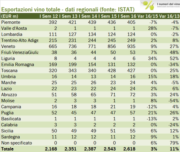 Chiudiamo la “saga” delle esportazioni annuali di vino italiane con l’analisi dettagliata per regioni, che viene da due diversi set di dati. Un’analisi fatta da ISTAT sulle categorie ATECO, dove vengono recensite le esportazioni per regione italiana (ma non necessariamente di vini di quella regione); una seconda analisi più dettagliata sui vini fermi imbottigliati, dove vengono specificate le categorie di qualità (DOC/IGT/VdT) e i dati di alcune regioni, questa volta riferiti all’origine del prodotto e non all’indirizzo di chi ha esportato.