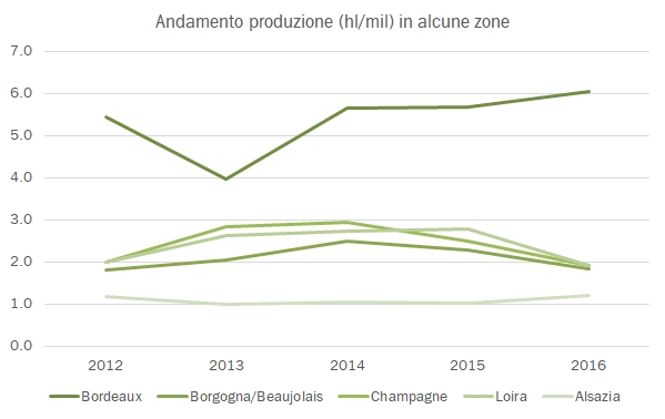 A differenza dell’Italia, la produzione di vino in Francia nel 2016 non è riuscita a riconfermare i buoni livelli raggiunti nel 2015. I dati che presentiamo oggi però vanno letti con attenzione, perché se è vero che la produzione è calata del 7% a 44.4 milioni di ettolitri, bisogna sottolineare alcuni dati “meno negativi” degli altri. Prima di tutto si registra un forte calo del prodotto destinato alla distillazione di Cognac e Armagnac, -14%, che impatta 1.2 dei 3.4 milioni di ettolitri del calo. Secondo, un altro mezzo milione di ettolitri di vino che manca fa parte della categoria “altri”, cioè dei vini non di qualità. Infine, esulando dai dati puramente produttivi, si assiste dopo diversi anni alla stabilizzazione del vigneto francese a 750mila ettari, dopo un calo strutturale durato diversi anni. Invece, da un punto di vista della produzione per area geografica, possiamo notare nel primo grafico come la produzione sia calata da tutte le parti meno che a Bordeaux, dove dopo diversi anni in calo si sono prodotti di nuovo 6 milioni di ettolitri di vino. Passiamo ad analizzare i numeri.