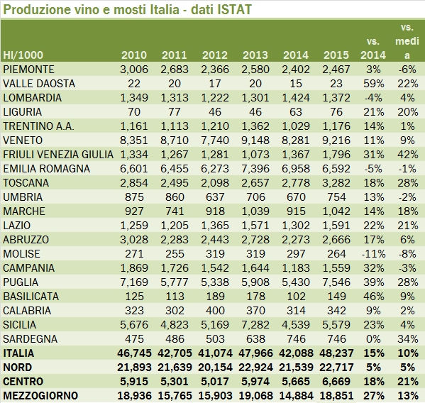 I dati aggiornati di OIV sulla produzione di vino 2015 non hanno portato sostanziali novità. Diciamo che la parola d’ordine sembra “stabilizzazione”. Stabilizzazione della superficie vitata mondiale, che sembra aver toccato il punto di minimo nel 2011-2012 a poco meno di 7.5 milioni di ettari vitati e ora veleggia a 7,534,000 ettari; stabilizzazione della produzione di vino che tra alti e bassi locali negli ultimi due anni è stata di 270 milioni di ettolitri circa, cinque più, cinque meno. Stabilizzazione anche dei consumi, che mai si sono ripresi dalla botta della crisi 2009, e stanno sempre intorno ai 240 milioni di ettolitri annui (magari ci facciamo un post più avanti quest’anno). Tornando all’argomento del giorno, la produzione 2015, l’ultima stima da 274.4 milioni di ettolitri, 6 in più del 2014, ma uno in meno rispetto a quello che era uscito a ottobre dell’anno scorso. L’Italia continua ad essere in cima alla lista, con 49.5 milioni di ettolitri (vi ricordo che ISTAT ha fornito una indicazione di 48.2 milioni di ettolitri per la produzione di vino, incluso mosti). Questa piccola discordanza mi serve per ricordarvi che i dati OIV che trovate in questo post differiscono in modo SOSTANZIALE con quelli che commentiamo dalle fonti dirette nazionali di produzione e che finchè non troverò il tempo (ma soprattutto il modo) di fare una “fonte Inumeridelvino”, continueremo a tenere i dati OIV sulla produzione mondiale “così come sono” anche se per alcune annate sembrano effettivamente fuori luogo. Passiamo a commentare i dati.