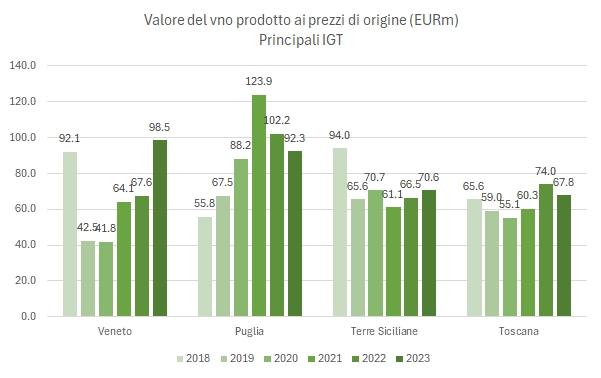 Le 5 maggiori IGT italiane rilevate dal database ISMEA sono Puglia con quasi 1.5m/hl di produzione, Veneto con 1.26m/hl, Emilia e Terre Siciliane con 0.9m/hl ciascuna e Toscana con 0.7m/hl. Se guardiamo al valore della produzione medio dell’ultimo triennio, è ancora Puglia IGT la maggiore in Italia con poco più di 100 milioni di ettolitri, mentre la IGT che ha coperto la maggior superficie vitata è Terre Siciliane con oltre 20mila ettari.