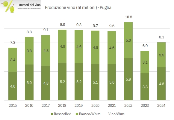 La Puglia è la seconda regione italiana per quantità di produzione di vino e la prima di gran lunga quando si parla di vino rosso secondo ISTAT. La produzione di vino 2024 è stata in forte recupero (+17% a 8.1 milioni di ettolitri, rispetto al dato italiano di +13%) ma resta comunque inferiore alla media storica, che è nell’intorno degli 8.6m/hl. Come già abbiamo avuto modo di commentare nel caso del Veneto, il 2024 vede una forte crescita della categoria IGT, nel caso della Puglia vicina al +50% sia contro il 2023 che contro la media storica, fino a un livello record del 40% del totale della produzione, a discapito dei vini da tavola, con i vini DOC che crescono leggermente di peso ma restano sotto il 10% del totale. Stranamente, da qualche anno sta riprendendo quota la produzione di vino rosso (57% del totale), probabilmente grazie al grande successo nella grande distribuzione di alcuni prodotti come il Primitivo.