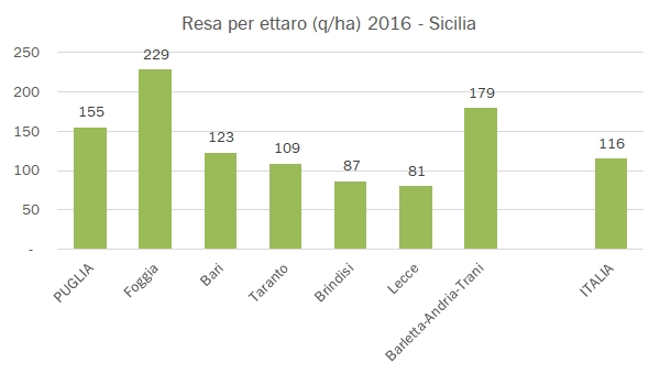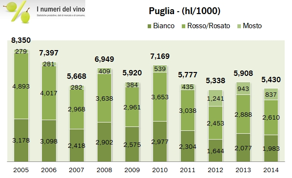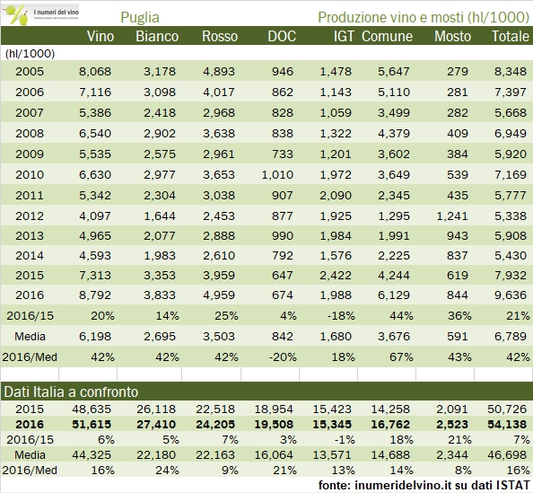 I dati di produzione della Puglia per il 2016 sono straordinariamente positivi. Basta guardare i grafici per notare l’evidente progressione della produzione, che da un livello di 5-6 milioni di ettolitri che sembrava essere diventato lo “standard” nel 2011-14 si è portata a 9.6 milioni di ettolitri (compresi i mosti) nell’ultima vendemmia. Ora, i grafici dicono anche un’altra cosa: che questo forte incremento di produzione non si è verificato nei vini di qualità, ma si è bensì scaricato soprattutto sui vini comuni, mentre la produzione di vini DOC secondo ISTAT è largamente inferiore ai livelli raggiunti negli anni che sembravano “standard” (apparentemente soprattutto nel segmento dei vini bianchi), con un calo del loro peso dal 20% raggiunto qualche anno fa a soltanto l’8% del 2016. Per darvi un’idea delle proporzioni, la Puglia rappresenta il 14% della produzione italiana di vino, ma soltanto il 3% della produzione DOC (il 25% della produzione di vini comuni). Passiamo all’analisi dei dati.