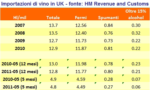 I numeri che analizziamo oggi sono derivati dalle dichiarazioni della dogana inglese relativamente alle autorizzazioni di rilascio di prodotti alcolici nel mercato inglese. Si tratta quindi di un dato che e’ relativo al mercato del vino più che alle sole importazioni. Essendo peraltro la produzione locale irrisoria, i due dati si sovrappongono quasi perfettamente. La conclusione di questo rapporto è che i volumi nel mercato inglese sono stabili e non si muovono ormai da qualche anno, mentre continua a crescere il valore medio del mercato (questo è il dato nuovo che fino a qualche tempo fa non era disponibile). Questa tendenza è anche piuttosto marcata, dato che tra il 2007 e il 2011 il mercato a volume è calato del 4% (cumulativamente) mentre il valore in sterline è cresciuto del 30%. Addentriamoci nei dati, con l’unica avvertenza di considerare che i dati a valore sommano sia i vini tradizionali che quelli aggiunti di alcol, mentre i volumi sono disponibili separatamente, e quindi noi ci occupiamo di quelli relativi ai vini tranquilli. Una seconda conclusione, forse ancora più importante, è che la quota di mercato del prodotto vino rispetto al totale del valore degli spirits nel mercato inglese continua a crescere: nel 2007 era il 31% del valore, nel 2011 siamo arrivati al 33.5%. Andiamo ai numeri.