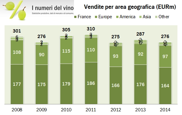 Anche per Vranken Pommery il 2014 non è stato un anno generoso. Il business, più diversificato di quello di Lanson, ha subito una minore pressione sui margini ma il tema della debolezza della Francia ricorre anche in questo caso. Vranken ha ristrutturato la sua attività nei vini fermi, apportandola a una JV, con un’operazione neutra sul fatturato ma leggermente negativa sui margini. Senza quella, i numeri sarebbero stati stabili. Il 2014 è stato dunque un anno di “riordino” dell’attività e di leggero calo del debito, che resta una priorità anche per il 2015, quando i numeri saranno diversi (meno fatturato e meno margini) per via del trasferimento di parte dell’attività alla joint venture. Nei primi 3 mesi dle 2015 le vendite infatti calano da 54 a 46 milioni, ma sarebbero cresciute del 3% a perimetro comparabile, mentre le vendite dei vini della società Listel, apportata nella joint venture, sono cresciute del 9%. Andiamo ad analizzare qualche numero insieme.