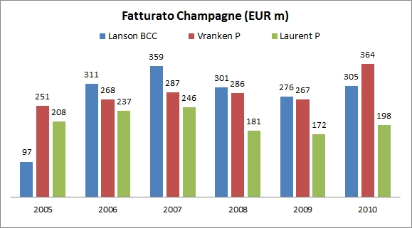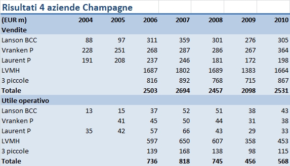 Da ormai qualche anno stiamo seguendo i risultati delle aziende della Champagne. Ci sono diverse aziende quotate e sono una specie di “faro” del mondo degli spumanti mondiali. Vi presento oggi qualche dato storico aggiornato fino al 2010 relativo all’andamento delle vendite e dell’utile operativo, dove esce una chiara indicazione (gia’ diverse volte commentata nei singoli bilanci): dopo la crisi del 2009 c’e’ stato un forte recupero delle vendite ma non dei margini di profitto. Le vendite cumulate delle 4 principali aziende quotate del settore (LVMH, Lanson BCC, Vranken Pommery e Laurent Perrier) sono salite del 21% e sono tornate al livello del 2008 (quando gia’ la crisi era iniziata). L’utile operativo cumulato e’ cresciuto del 24%, quindi con un leggerissimo miglioramento del margine, ma resta pesantemente sotto i livelli degli anni precedenti.