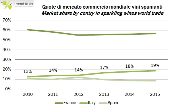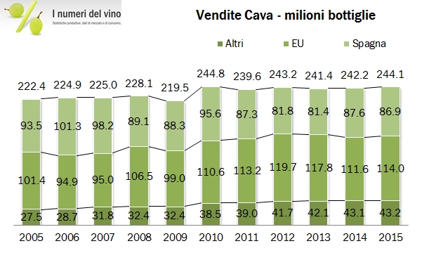 Le esportazioni spagnole di vino sono cresciute quasi come quelle italiane nel corso dei primi sei mesi, nonostante una dinamica molto negativa dei volumi, legata all’andamento delle vendemmie iberiche, caratterizzate da una incredibilmente ricca produzione nel 2013 e in parte 2014 che si è poi normalizzata nel corso del 2015. La Spagna resta saldamente il leader mondiale nelle esportazioni a volume, 11.5 milioni di ettolitri in sei mesi (-6%), e la terza potenza mondiale in termini di valore esportato, quasi 1.3 miliardi di euro (+2.4%) da gennaio a giugno. A differenza dell’Italia, la Spagna fa fatica a crescere nel segmento spumanti (proprio “sotto attacco” dei nostri prodotti, che hanno una qualità simile a una fascia di prezzo più contenuta), ma va meglio di noi nel segmento dei vini fermi imbottigliati, che con un +5% sono il vero driver dell’export del periodo (quando invece sono il punto debole per le nostre esportazioni). Da un punto di vista geografico, va notato il calo ulteriore del prodotto spagnolo nel suo mercato più importante, la Germania (-5%) che però viene controbilanciato dall’ottima performance in USA (+11%, nonostante il cambio non aiuti più) e soprattutto in Cina, dove gli spagnoli hanno spedito vino per quasi 70 milioni di euro (+40%), contro il nostro magro bottino di 45 milioni di euro (+10%). Cosa ha per i cinesi il vino spagnolo più del nostro? Niente mi viene da dire, soltanto la capacità di essere venduto. Passiamo ai numeri.