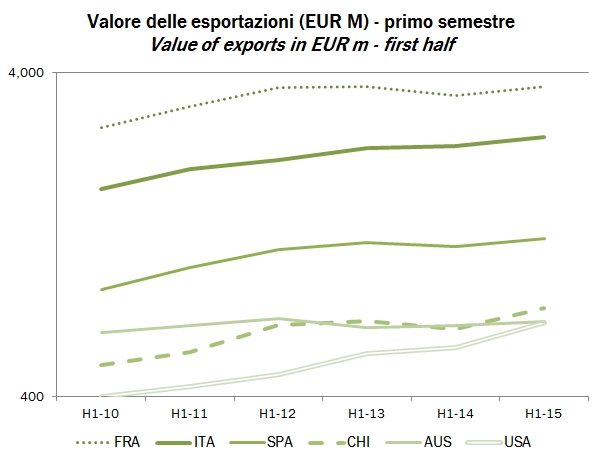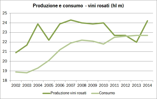 OIV ha pubblicato un rapporto sui vini rosati aggiornato al 2014, che ci consente di aggiornare le statistiche pubblicate un paio di anni fa in seguito al lavoro di Agrimere, che trovate in questo collegamento. I “rosati” una quota minoritaria della produzione mondiale di vino, circa il 9%, e il più delle volte è ricompreso tra i vini rossi. Sono una categoria che ha suscitato particolare interesse nei primi anni 2000, quando hanno avuto un grande sviluppo in alcuni mercati, soprattutto Francia e Regno Unito (non in Italia a dire il vero). Oggi sono prodotti e consumati in circa 23-24 milioni di ettolitri nel mondo, i maggiori produttori sono i francesi e gli spagnoli (31% e 24% della produzione 2014), seguiti dagli USA (14%) e dall’Italia (10%), mentre i maggiori consumatori mondiali sono di gran lunga i francesi che con 8 milioni di ettolitri di consumo (33% del totale mondiale) sono costretti a importarne anche un po’ dall’estero. Infine, vi presento un grafico interessante che mostra la penetrazione per fascia di età dove potete vedere che i vini rosati sono i vini dei giovani. La vera domanda è se questi giovani che bevono tanto rosato manterranno inalterate le loro abitudini di consumo avanzando con l’età… ma andiamo a leggere i numeri…