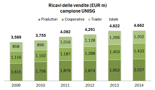 La particolarità del lavoro, che per certi versi ricorda l’indagine sul comparto vinicolo svolta annualmente da Mediobanca, è la segmentazione del settore tra le aziende vinicole produttrici, i cosiddetti “trader” che acquistano vino per confezionarlo e rivenderlo, e le cooperative. I dati a fine 2014 mostrano un settore in salute per le 103 aziende raccolte nel campione. Se il fatturato è cresciuto soltanto dell’1%, a 4.7 miliardi di euro, l’utile operativo è balzato a 259 milioni, con il contributo sia dei produttori di vino che dei trader. Ancora più rilevante è che a fronte di risultati in crescita l’indebitamento sia rimasto sostanzialmente stabile, il che ha portato a un ulteriore rafforzamento dei rapporti patrimoniali. Con un rapporto debito su MOL di 2.4 volte per i produttori di vino e 2.6x volte se includiamo anche trader e cooperative, il settore del vino appare molto meno indebitato che in passato: potrebbe essere un buon momento per spingere delle aggregazioni e creare operatori più forti per aggredire nuovi mercati.