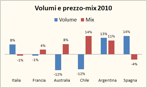 Constellation Brands ha pubblicato i risultati 2010 che proseguono sulla falsalinea di quanto riportato nel terzo quarto dell’anno. Gli aspetti chiave sono: (1) rifocalizzazione dei marchi e della strategia distributiva USA; (2) taglio costi aggressivo fuori dagli USA; (3) riduzione del debito e riacquisto di azioni. Il quarto trimestre e’ stato buono cosi’ come era stato annunciato. Non solo le vendite USA sono aumentate del 10% a pari perimetro, ma l’azienda ha anche goduto di un impatto positivo dalle tasse. Alla fine l’utile per azione e’ stato superiore alla fascia 1.8-1.85 dollari annunciata a Gennaio, avendo raggiunto 1.91$. Quali sono le attese e la strategia di CB per il 2011: (1) l’utile e’ atteso stabile a 1.9-2$ per azione, quindi perlomeno stabile; (2) l’azienda ha pianificato un ulteriore riacquisto di azioni proprie per 500m$, che praticamente si mangera’ la maggior parte dei 600-650m$ di generazione di cassa attesa nell’anno (in crescita rispetto ai 530m$ generati nel 2010); (3) continuare la riduzione del debito, che e’ sceso di 600m$ nel 2010, con il debito/MOL sceso a 3.2x. Nel 2011 (anno fiscale 2012), Constellation sara’ impattata dal confronto negativo derivante dagli acquisti obbligati dei distributori americani che non si ripeteranno nel 2010. La generazione di cassa e’ prevista aumentare ancora, probabilmente grazie al capitale circoltante.
