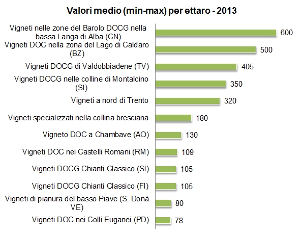 Riprendiamo l’argomento del valore delle vigne con l’aggiornamento al 2016 dei dati di CREA sul valore dei vigneti per denominazione. È questo un modo diverso di vedere il mercato, rispetto ai dati puntuali, ma con riferimenti regionali e provinciali, pubblicati qualche giorno fa. I dati sono “esempi”, quindi non sono rilevazioni puntuali; infatti qualche difetto si trova, come il valore massimo delle transazioni a Barolo, fermo da diversi anni a 1 milione di euro, che sappiamo non essere più un riferimento valido. Nel loro insieme, però, i dati sono molto coerenti con quelli che menzionavo sopra. La “media delle medie” delle variazioni di prezzo è del +2% per il 2016, un dato leggermente superiore al +1% che si ricava dai dati a livello italiano, ma che ovviamente si riferisce a un campione diverso, fatto su zone particolarmente vocate. Questo +2% monta su un +1% circa dello scorso anno, il che porta la rivalutazione dal 2000 a questa parte al 50% circa. Coerente è pure l’evidenza che in alcune zone come quella di Trento si assiste a un calo delle valutazioni dei vigneti rispetto al passato. Ma passiamo a qualche dato.