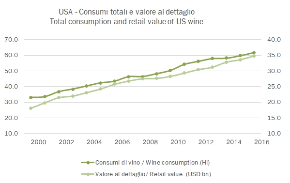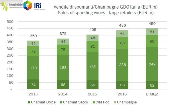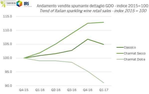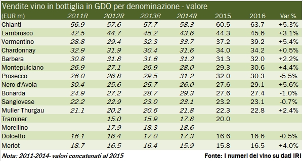 Gli andamenti strutturali del mercato restano immutati: i volumi di consumo sono in costante calo (-1.3% nel 2016) e sono compensati dal miglioramento del prezzo-mix (+1.8% per arrivare a un andamento delle vendite leggermente positivo), all’interno del quale è il mix che la fa da padrone: i vini DOC nel 2016 sono cresciuti in volume del 2.6% contro un calo di quasi il 3% dei vini da tavola. Infine, resta molto sostenuto l’andamento dei vini spumanti che fanno +8% come era già successo nel 2015.