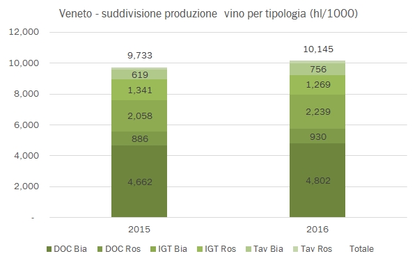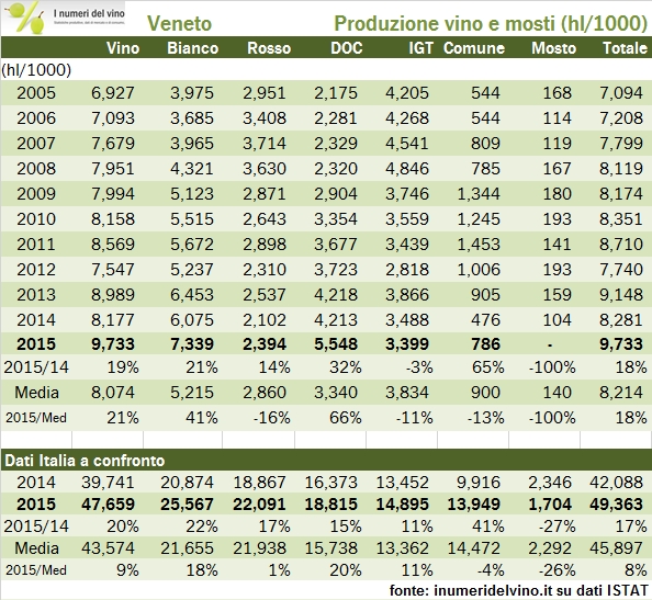 La produzione di vino in Veneto tocca per la prima volta quota 10 milioni di ettolitri, con un incremento del 4% rispetto al 2015 che si origina nel segmento dei vini bianchi soprattutto nelle categorie IGT e Vini da Tavola, mentre i vini DOC crescono leggermente di meno. La vendemmia in Veneto è peraltro paragonabile ai dati italiani che abbiamo attualmente a disposizione, che vedono un incremento del 3% della produzione di vino a 50.1 milioni di ettolitri. Il Veneto dunque rappresenta il 19% della produzione nazionale, ma molto di più dei vini bianchi (27%) e ancora di più dei vini bianchi DOC, che sono il 45% della produzione italiana (4.8 milioni di ettolitri rispetto a 10.6 totali). Passiamo ad analizzare i dati dettagliati.