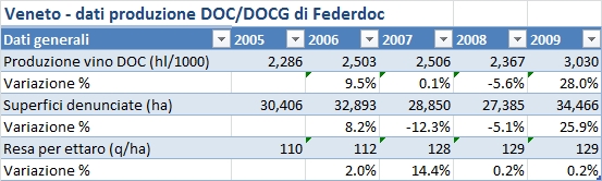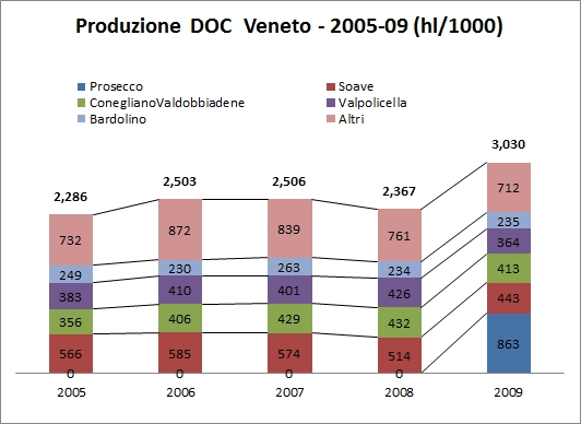 Per poter fare questo post sulle DOC Venete, ho diciamo così integrato i dati Federdoc con altre fonti (AGEA) in modo da poter colmare un gigantesco buco di 1 milione di ettolitri. Il quadro che ne esce è di una produzione DOC nel 2010 di 3.3 milioni di ettolitri, che magicamente è la medesima (50mila ettolitri più o meno) di quella rilasciata da ISTAT. Quindi, ho deciso di pubblicare. Il tema è semplice, anche perché ho appena scritto (non pubblicato) il medesimo post sull’Emilia Romagna. Se in Emilia Romagna le grandi DOC diventano piccole, in Veneto le grandi DOC diventano sempre più grandi. Con grande beneficio per il valore del marchio. E di marchio ormai affermato qui qualcuno ce n’è: Prosecco, Conegliano Valdobbiadene, Soave, Bardolino, Valpolicella. Vini che possono piacere o meno, ma chiaramente un approccio al “business” corretto. Fare scala su pochi grandi nomi per fare breccia nei mercati esteri. Bene, adesso che vi siete beccati il pippone, andiamo con i numeri.