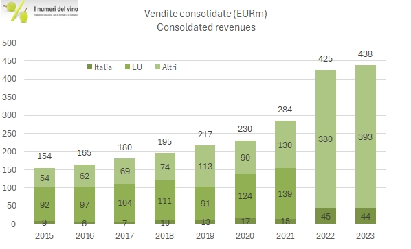 Introduciamo oggi nel blog una nuova azienda che negli ultimi anni è rapidamente cresciuta fino ad arrivare a ridosso delle top 10 italiane. Si tratta di Mack & Schuhle Italia (M&S di qui in avanti), che nel 2023 ha avuto un fatturato in crescita del 67% a 172 milioni di euro. M&S è un’azienda giovane, nata nel 2008 per iniziativa della famiglia Angelillo allo scopo di commercializzare vino, con un altro nome. Negli anni successivi sono stati aperti stabilimenti, acquistate cantine e nel 2016 il distributore tedesco Mack & Schuhle si compra il 50%, quota mantenuta sino ad oggi (l’altro 50% di proprietà della famiglia fondatrice). Proprio nel 2022 cambia nome per diventare Mark & Schuhle Italia. Nel 2023 ha commercializzato 59 milioni di bottiglie, quindi circa 0.4 milioni di ettolitri di vino. Gli stabilimenti produttivi sono in Puglia e Friuli Venezia Giulia, ma ha accordi per l’acquisto di vini in Sicilia, Toscana, Emilia Romagna, Veneto, Lombardia e Piemonte. Veniamo ai numeri: la M&S ha margini limitati, 3.5% EBITDA e un capitale investito (24 milioni) molto basso rispetto alla sua dimensione commerciale (172 milioni di fatturato). Siamo quindi di fronte a un’azienda con una limitata integrazione verticale, ma ovviamente se guardate il grafico qui sopra… da 12 milioni di fatturato nel 2016 a 172 nel 2023… con un grande successo. Bene, nel resto del post commentiamo tutti i numeri e altri grafici.