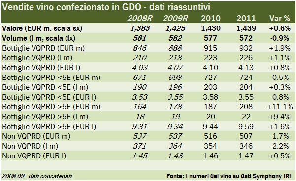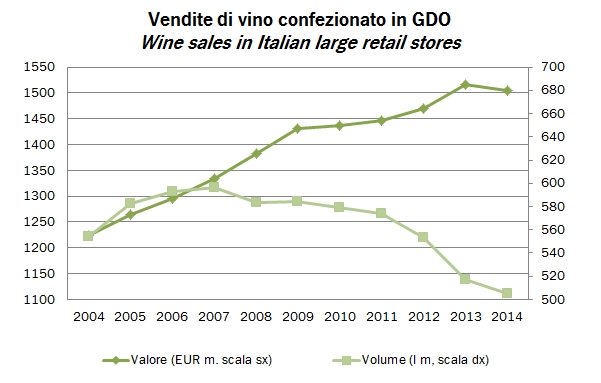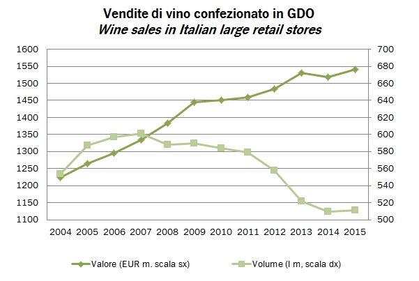 Vinitaly ha pubblicato le anticipazioni sulle vendite di vino in GDO 2015, che sono cresciute dell’1.4% nel 2015, a un valore (che è il totale del campione che viene aggiornato di anno in anno) di 1.54 miliardi di euro. Il dato è positivo, come dice il comunicato, anche se si appoggia su un 2014 piuttosto negativo (-0.7% a causa del forte calo dei volumi). All’interno dei numeri ci sono delle tendenze piuttosto importanti: 1) quella, ben conosciuta, dei vini Bio, che perè sono ancora meno di 10 milioni di euro rispetto a un totale di oltre 1.5 miliardi; 2) una seconda, secondo me molto importante, che è lo spostamento del mercato verso i vini bianchi. Non stiamo parlando solo di spumanti, che peraltro vanno bene (+8%), ma anche dei bianchi fermi. Il Vermentino ha “distaccato” il Prosecco con una crescita del 10%; 3) la crescita di due formati, su cui si sta polarizzando gradualmente il mercato: le bottiglie e il bag-in-box (peraltro su un livello molto contenuto di vendite). Andiamo ad analizzare i dati insieme.